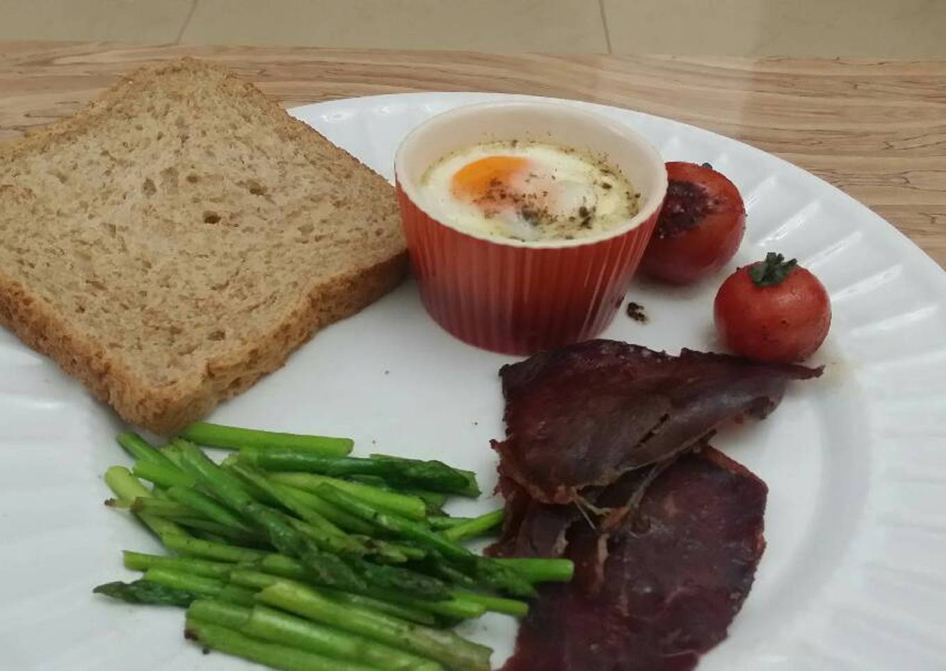 - Serve the egg with pastirma, asparagus and brown bread.