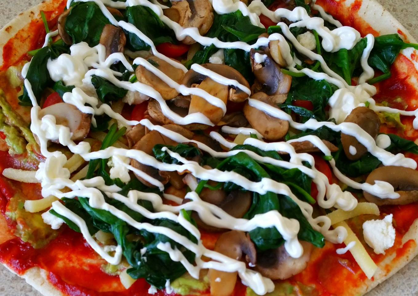 - Sprinkle mozzarella on the base then spread sliced cherry tomatoes, ricotta cheese, mushrooms and spinach over the entire pita.