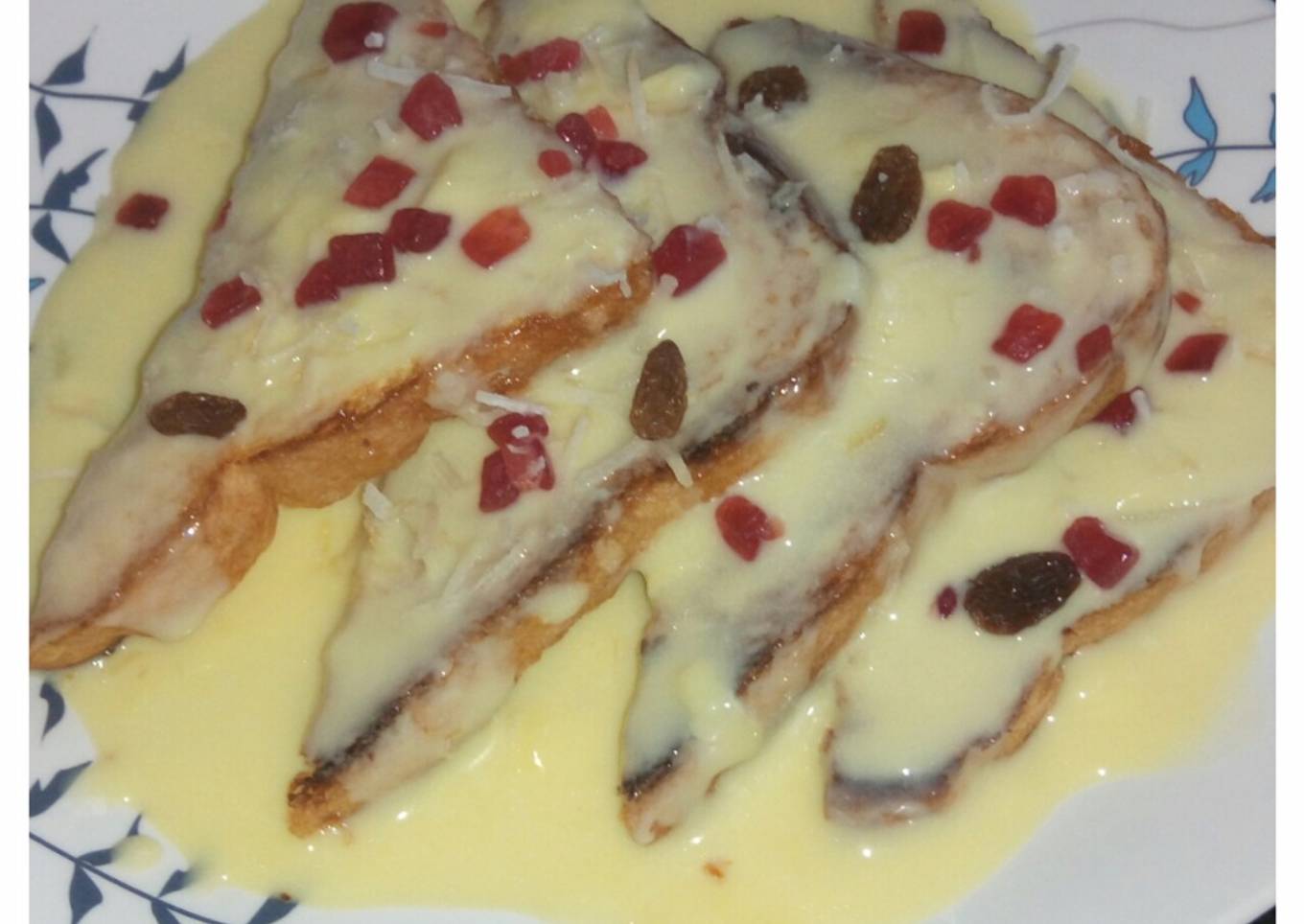- Arrange bread pieces in serving bowl spread curstard mixture