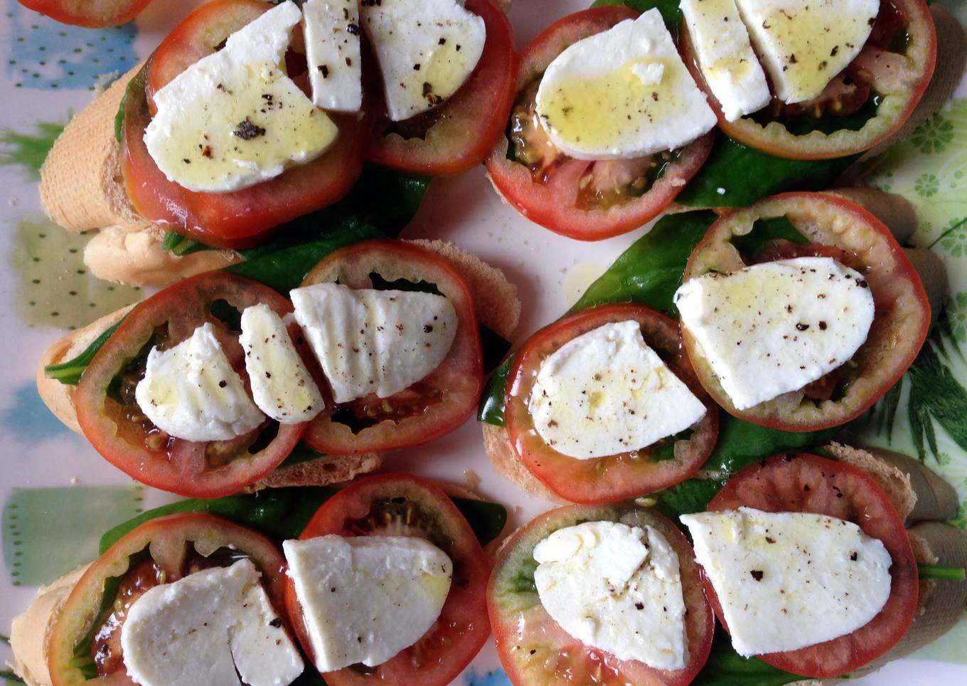 - Drizzle a little dressing on the bread. Layer spinach, tomato slices and cheese. Drizzle with remaining dressing.