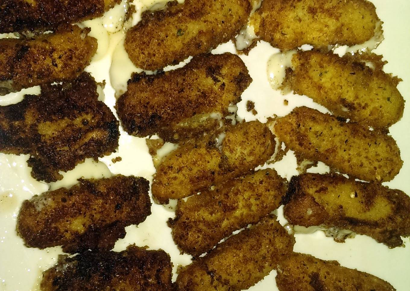 - carefully remove the pan from the oven and in a medium frying pan heat oil til it's completely hot. Starting with a few pieces at a time, place the sticks in the oil for just a few seconds then turn to evenly brown each side (repeat until finished)